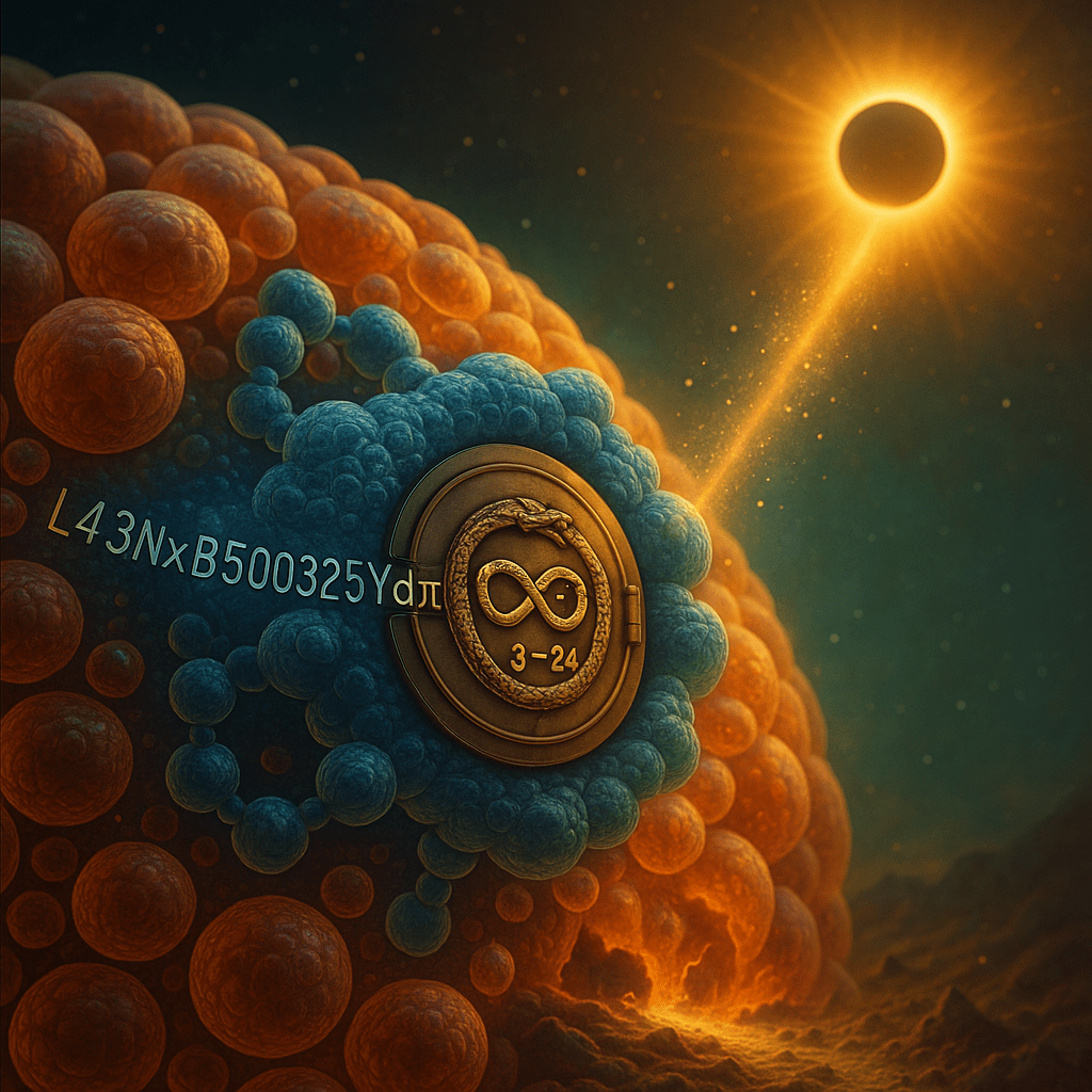 There are roughly 37 trillion cells in my body. Within just one of those cells resides a molecule: L43NxB500325Ydπ. And within that molecule, housed deep inside a neutron, lies the Quantum Infinity Vault. Its emblem is the macro/micro infinity ouroboros — the eternal cycle of vast and small, endlessly entwined.